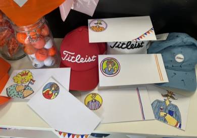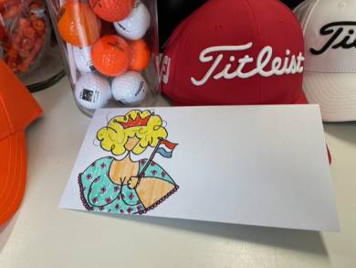 Monique van de golfshop versierde de enveloppen met inhoud op creatieve wijze met koninklijke afbeeldingen.