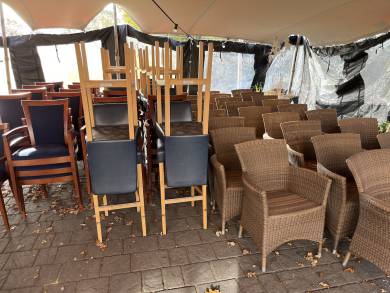 Het oude meubilair uit het restaurant (barkrukken, tafels en stoelen) is te koop voor de eenheidsprijs van €10,- per stuk.