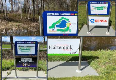 Afgelopen week zijn op Waterrijk de eerste frames op de afslagplaatsen vervangen (hole 10 t/m hole 14). Veel frames zijn gebutst door balinslagen en hard aan vervanging toe.