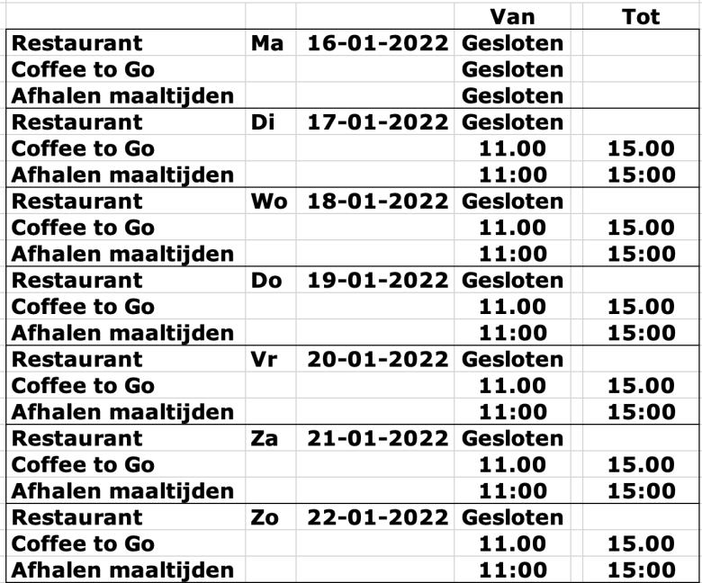 Hierbij treft u de tijden aan waarop van 10-01 t/m 16-01 Coffee to Go kan worden gehaald.